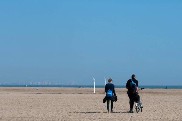 Poca gente camina en una playa en Valencia, España, luego que el país confirmó más de 1.500 nuevos casos de coronavirus entre el viernes y el sábado, elevando su total a 5.753 casos, el segundo número más alto en Europa después de Italia. Foto AFP