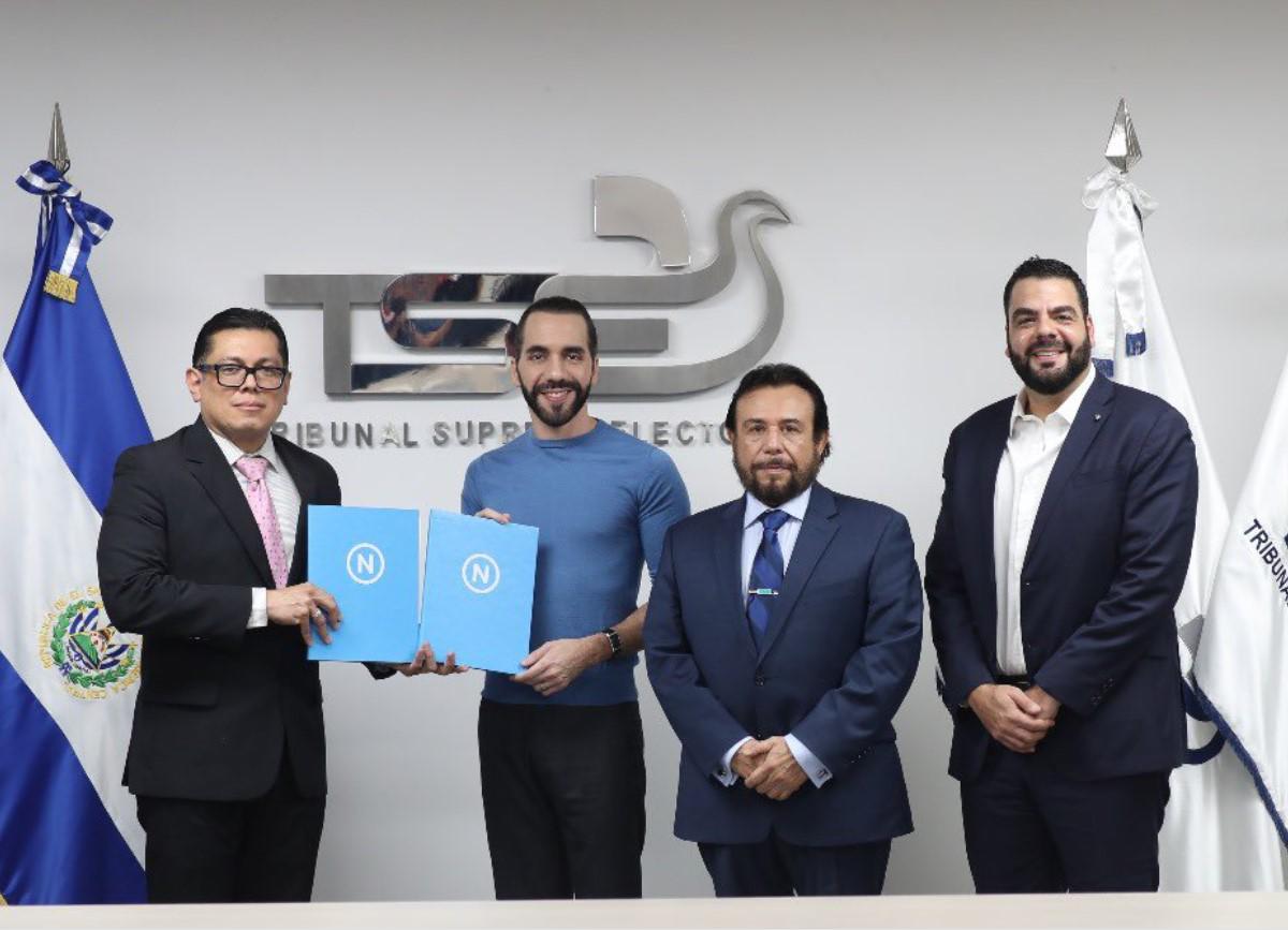 Bajo fuerte seguridad, Bukele, junto con su compañero de fórmula, el vicepresidente Félix Ulloa, acudió al Tribunal Supremo Electoral (TSE), en San Salvador, donde decenas de seguidores coreaban "¡Nayib!" y "¡reelección!", constataron periodistas de la AFP.