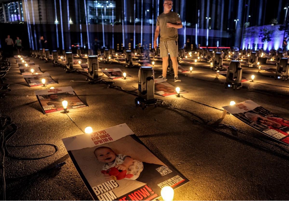 Frente al emblemático teatro Colón, una campaña exhibió los retratos de algunos de los cerca de 200 rehenes de Hamás para exigir su liberación.