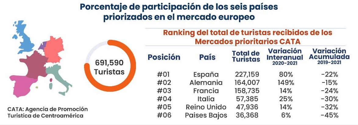 De un total de 1,2 millones de turistas que se registraron del continente europeo, la mayoría provino de los mercados priorizados por la Agencia de Promoción Turística de Centroamérica (CATA): España, Alemania y Francia, le siguen Italia, Reino Unido y Países Bajos (691.590).