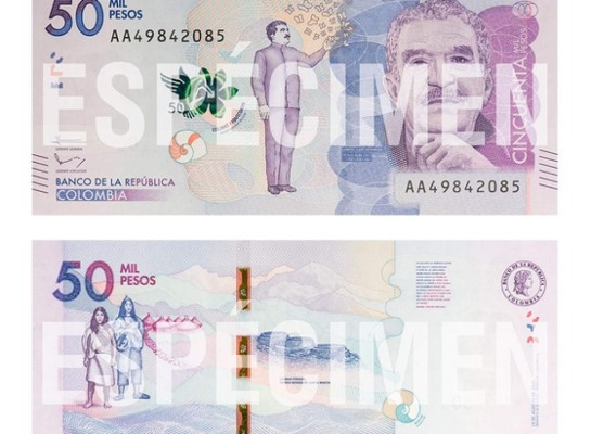 Este papel moneda hace un homenaje al nobel colombiano, Gabriel García Márquez, quien en una de las caras aparece levantando su brazo izquierdo rodeado de mariposas.
