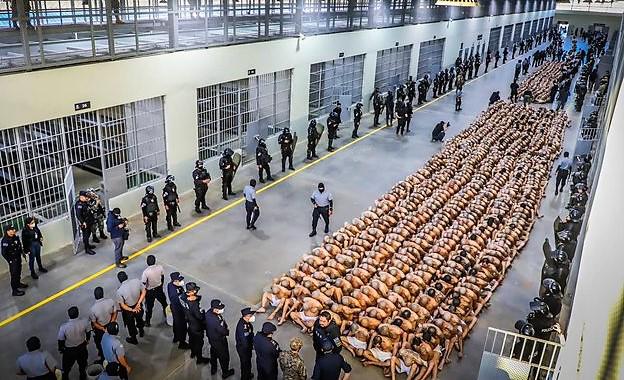 En un vídeo que el mandatario compartió en Twitter, se observa a muchos pandilleros con sus torsos desnudos, vistiendo apenas un pantaloncillo blanco y descalzos, custodiados por policías y alineados en un gran patio de otra prisión del occidente del país.