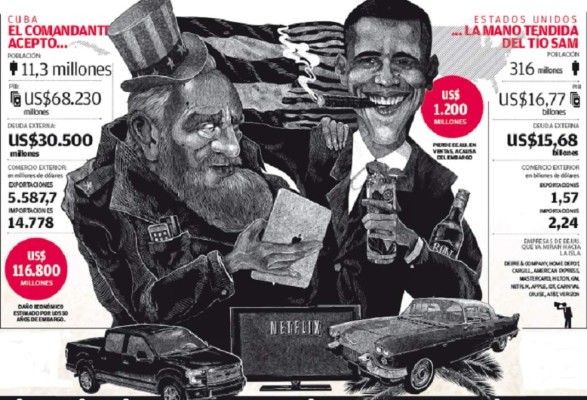 Castro, Raúl, se sentó a dialogar a la mesa con Obama en la Cumbre de las Américas. Castro, Fidel, - no cabe duda- ha dado el beneplácito a los pasos que su hermano ha dado para propiciar el acercamiento entre Cuba y EE.UU. tras 50 años de algo más que frío distanciamiento. Pero las palabras de Castro (Raúl) elogiando a Obama en la Cumbre de las Américas en Panamá dejan poco lugar a la duda: 'Obama es un hombre honesto al que admiro', lo que marca un antes y un después en las relaciones continentales, poniendo fin a los últimos rescoldos de la Guerra Fría, o al menos eso parece que quieren decir las palabras del líder cubano: 'Diez presidentes (de EE.UU.) tienen deudas con nosotros, pero no el presidente Obama'. En todo caso, si bien se están dando pasos para el pleno restablecimiento de relaciones, también es cierto que el bloqueo continúa, y que seguirá siendo la carta de la retórica antiimperialista de los líderes del "Socialismo del siglo XXI" hasta que no se ponga fin al mismo.