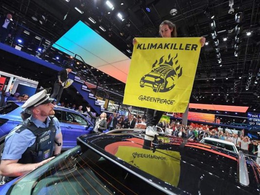 El grupo también se manifestó el jueves en el estand de Volkswagen y de BMW durante una visita de la canciller alemana Angela Merkel a la feria. Varios manifestantes se encaramaron a vehículos SUV y desplegaron pancartas en las que se leía 'Asesinos del clima'.
