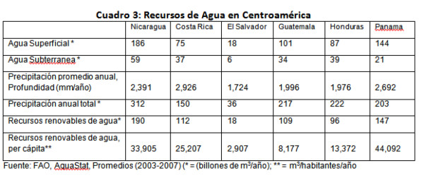 Nicaragua tiene también los mayores recursos del agua de Centroamérica. Como lo muestra el Cuadro 3, el país tiene la mayor extensión de agua fresca superficial, dos veces mayores a la de Costa Rica y Honduras, y diez veces mayor a la de El Salvador. Nicaragua tiene los mayores recursos de agua subterránea, la mayor precipitación lluviosa en volumen, y la tercera mayor profundidad en la precipitación lluviosa. Tiene el mayor nivel de fuentes renovables de agua, y el segundo mayor nivel de fuentes renovable de agua per cápita.