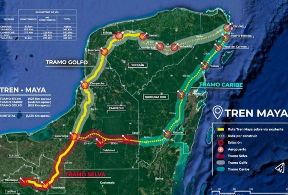 Con una inversión de aproximadamente US$6.300 millones, el Tren Maya será erigido sobre parte de una vía ya existente y recorrerá unos 1,500 kilómetros desde la zona arqueológica de Palenque, en el estado Chiapas, hasta la turística Cancún, en el estado Quintana Roo, en el sureste del país.