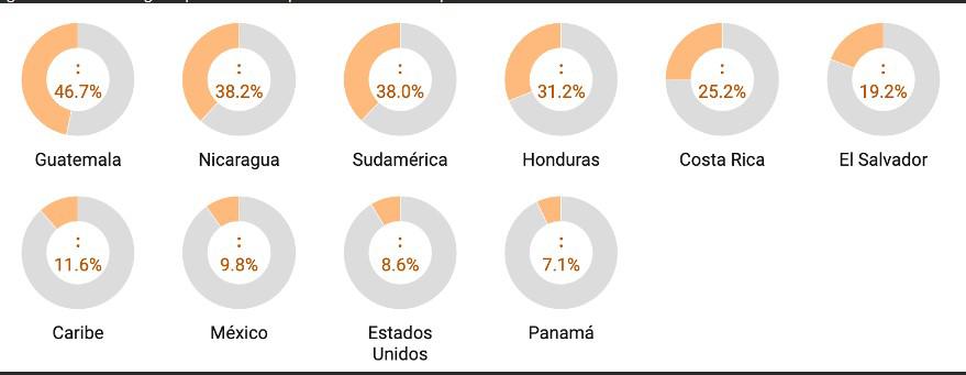 Así por ejemplo, si vemos el valor de las exportaciones por país reportadas en el Atlas de Complejidad Económica de la Universidad de Harvard, se encuentra que salvo por Panamá con un 7.1%; en el resto de los países, el peso de las Agro exportaciones es alto, pues en El Salvador representa 19.2% del valor total de todas las exportaciones, en Costa Rica 25.2%, en Honduras 31.2%, en Nicaragua 38.2%, y en Guatemala 46.7%. Como referencia, en Estados Unidos representa un 8.6% y en México un 9.8%.