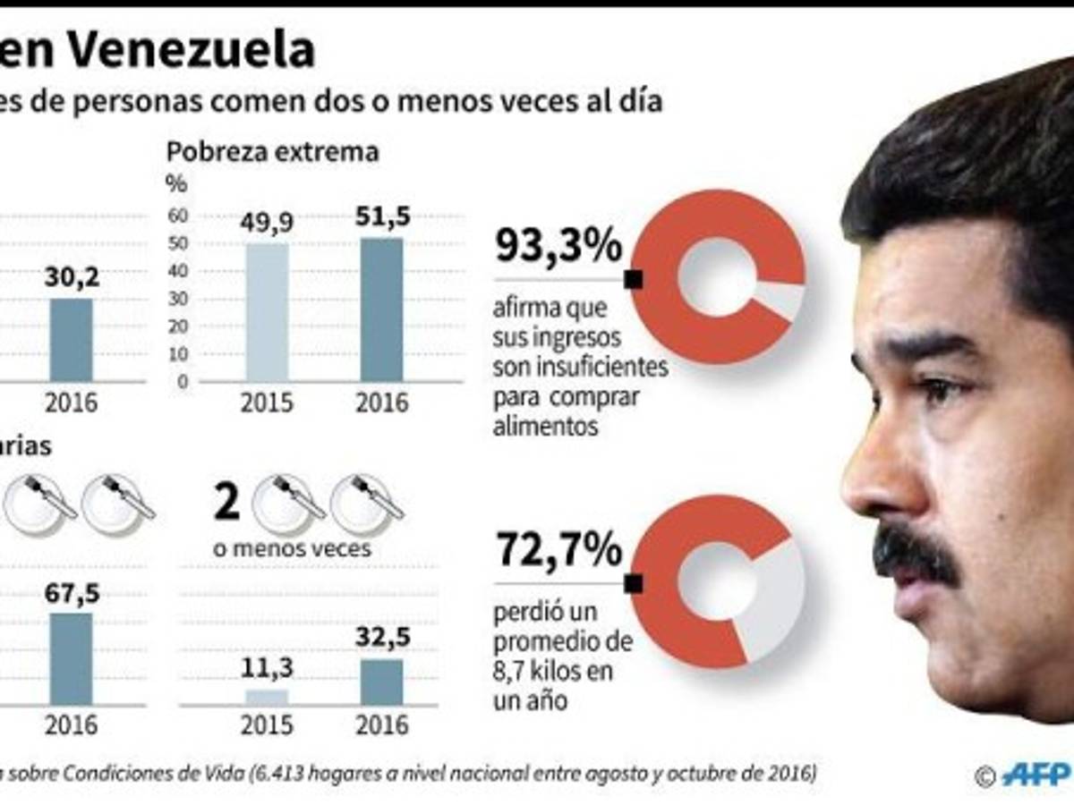 La Encovi estableció además que 9,6 millones de personas -casi un tercio de la población- ingieren dos o menos comidas al día. El porcentaje de quienes comen tres veces diarias bajó de 88,7% a 67,5% entre 2015 y 2016, y los que hacen dos o menos comidas aumentaron del 11,3% al 32,5%.