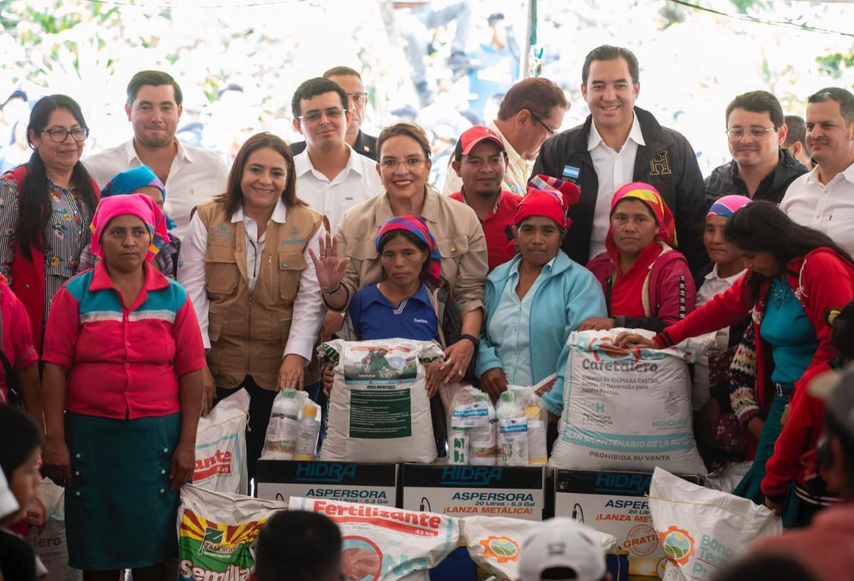 La presidenta hondureña Xiomara Castro entregó el bono tecnológico Productivo para postrera a habitantes del municipio de San Francisco de Opalaca, Intibucá.