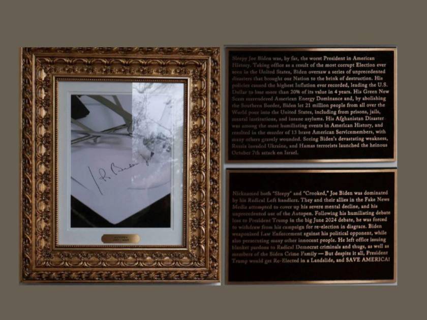 La imagen que correspondería a Biden, colgada en septiembre, es una fotografía de un bolígrafo automático, en alusión a que Trump considera que su antecesor no sabía lo que firmaba.