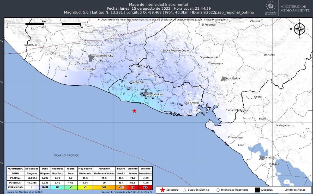 Un sismo de magnitud 5.0 fue registrado frente a las costas de El Salvador, la noche del lunes 15 de agosto.