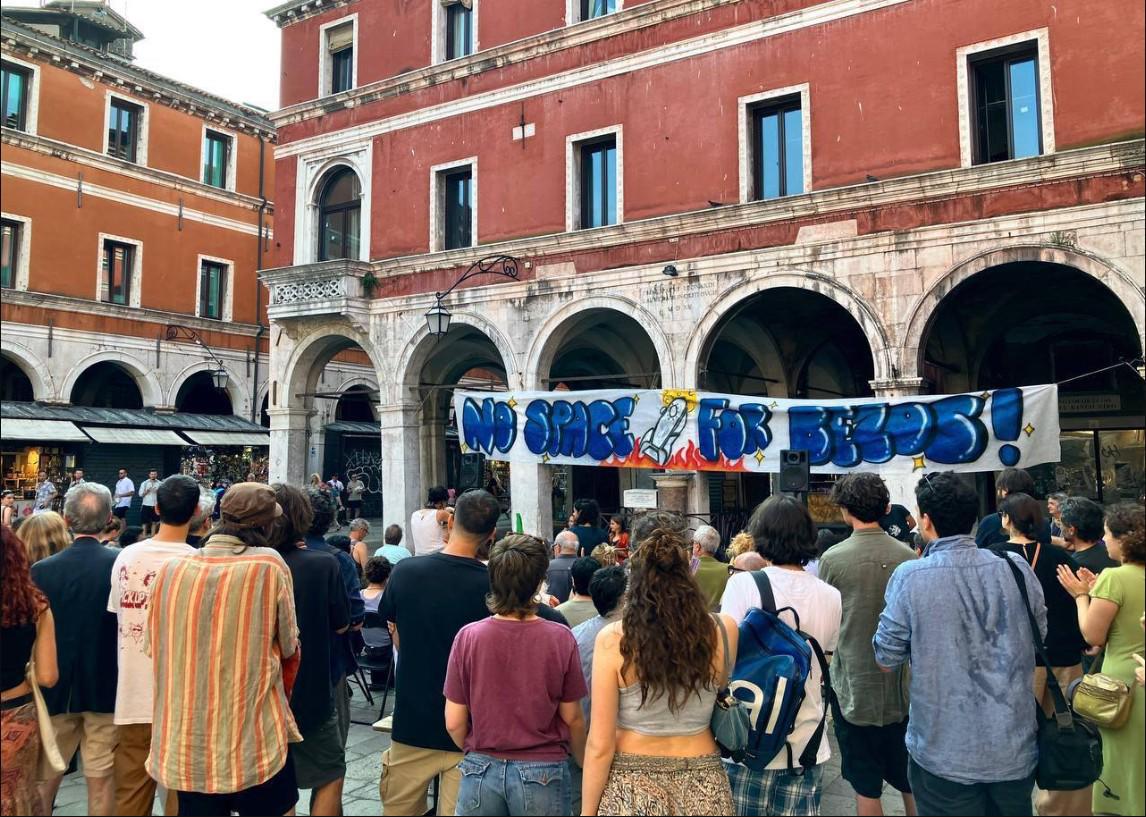 "No Space for Bezos" insistió en que "Bezos y sus secuaces" no son bienvenidos en la ciudad y animaron a los venecianos a organizarse para protestar contra el multimillonario.
