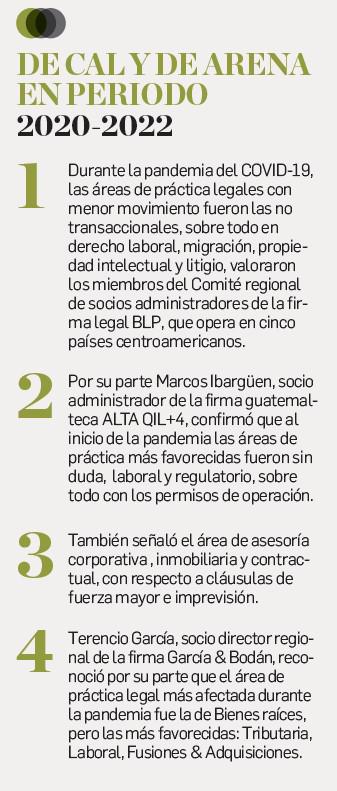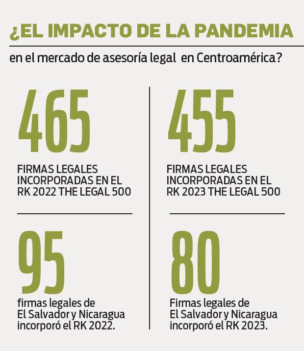 De acuerdo al comparativo entre ambos rankings del directorio The Legal 500, las áreas de práctica más afectadas por la pandemia y su impacto socioeconómico fueron en Costa Rica: Banca y Finanzas, Propiedad intelectual y Tributario. En El Salvador, en cambio, fueron Corporativo y Transaccional, Litigio y Propiedad intelectual. En Guatemala, Energía & Recursos naturales y Tributario.