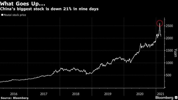 El impacto en las acciones chinas fue rápido: el índice CSI 300 cayó hasta 2.1% para liderar las bajas en Asia, mientras que Kweichow Moutai Co., el mayor contribuyente a las ganancias durante el ciclo de estímulo de 2020, cayó casi 5%. La mayor acción de China ha perdido más de US$100.000 millones en nueve días.