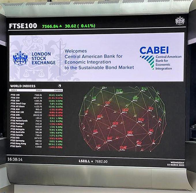 La Bolsa de Valores de Londres (LSE por sus siglas en inglés) recibió a una delegación del Banco Centroamericano de Integración Económica (BCIE) encabezada por su presidente ejecutivo, Dante Mossi, para celebrar su estreno en bolsa a través de su reciente bono global de US$1.250 millones con vencimiento en 2026 bajo su Marco de Bonos Sociales.