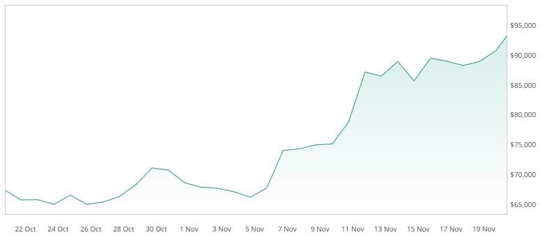 Bitcoin alcanzó otro máximo histórico, superando los US$94.800 la mañana del miércoles 20 de noviembre (un 2 % má sque la jornada anterior) y expertospredicen que podría alcanzar los US$120.000 a fines de marzo de 2025.