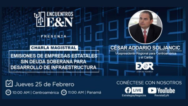 César Addario Soljancic, vicepresidente regional para Centroamérica y Caribe de EXOR Latam, expondrá sobre los mecanismos de emisiones de deuda más idóneos para las compañías estatales. La charla magistral se celebrará este jueves 25 de febrero, a las 10:00 a.m. hora de Centroamérica, 11:00 a.m. en Panamá.