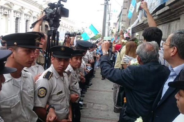 Mientras tanto otro grupo de personas muestran carteles que piden que se le retire al inmunidad al presidente Otto Pérez Molina, y señalan a quienes bloquean las entradas del Legislativo, como aliados del presidente. Además convocan para que a las 13 horas se realice una cadena humana al rededor del Legislativo para permitir el ingreso de los congresistas.