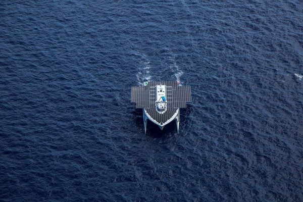 El barco, el catamarán solar más grande del mundo, el embajador de la fundación, es renovable y sostenible. No podía ser de otra manera. Alrededor de 512 metros cuadrados de paneles solares cubren la cubierta para que el sol recargue las cuatro toneladas de batería que porta en cada lado. "Con las baterías cargadas usamos una planta que genera 200 kilos hidrógeno del agua del mar y que se comprime en veinticinco tanques para propulsar el barco. Podemos ser completamente autónomos durante nueve días".