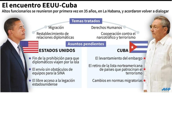 Por el otro lado, Cuba exige el levantamiento del embargo impuesto desde 1962, ser retirado de la lista de países que patrocinan el terrorismo internacional, y que Washington derogue la Ley de Ajuste Cubano de 1966, que privilegia a los inmigrantes cubanos ilegales en Estados Unidos.