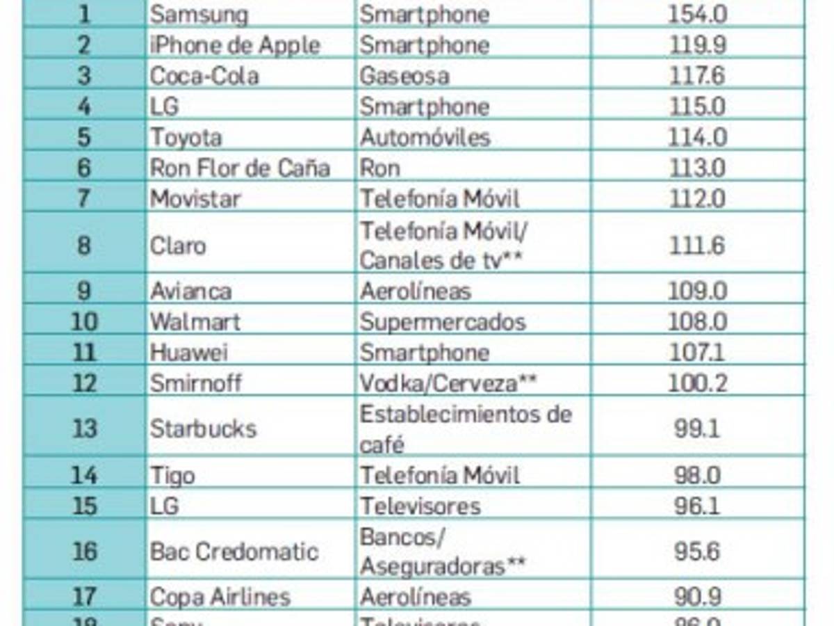 El TOP 20 centroamericano de este novedoso ranking registra las marcas más destacadas en la comunicación que tienen con el consumidor en el ámbito digital. Comprende 20 categorías: gaseosas, boquitas/snacks, cervezas, whisky, ron, vodka, TV, smartphones, automóviles, hoteles, aerolíneas, proveedores de telefonía móvil, supermercados, coffee shops, bancos, aseguradoras, universidades, canales de TV, revistas y marcas de lujo.
