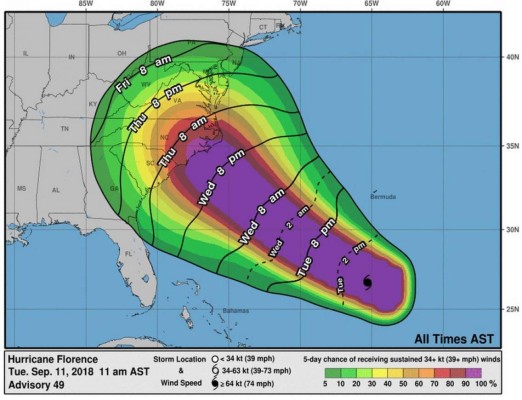 A las 8:00 de la mañana de este martes, el ojo de Florence estaba a unos mil 530 kilómetros al este-sureste de Cape Fear, Carolina del Norte, y avanzaba en dirección oeste-noroeste a 24 km/h.