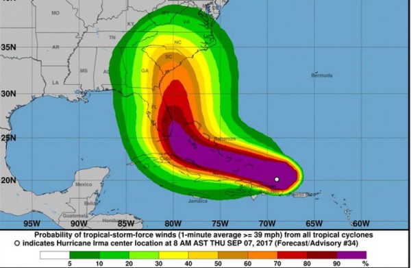 -El Centro Nacional de Huracanes con sede en Miami (CNH) prevé que este jueves Irma pase muy cerca de la isla La Española, compartida por Haití y República Dominicana. Para la tarde afectará a Turcos y Caicos. Cuba y Las Bahamas podrían recibir el impacto directo del huracán a partir del viernes.