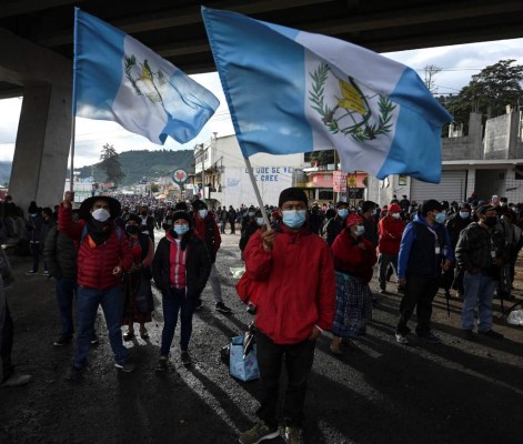 'Exigimos la renuncia de Consuelo Porras y el presidente Alejandro Giammattei', señalaron en una pancarta autoridades indígenas en el bloqueo de la capital, donde los manifestantes liberaron el paso luego de unas cuatro horas de cierre tras denunciar acoso de decenas de policías con equipo de choque.
