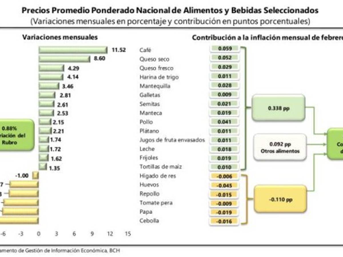 El índice de Precios al Consumidor (IPC) de Honduras presentó una variación de 6.37% en febrero 2022 al compararlo con el mismo mes del año anterior (inflación interanual), superior 3.87% observado doce meses atrás.Adicionalmente, al comparar febrero de 2022 con el mes anterior se observó una variación mensual de 0.35%. Los rubros con mayores aportes a la inflación mensual fueron: "Alimentos y Bebidas no Alcohólicas", "Educación", "Muebles y Artículos para la conservación del hogar", "Transporte", "Hoteles, cafeterías y restaurantes", "Recreación y cultura", "Cuidado personal" y "Salud".