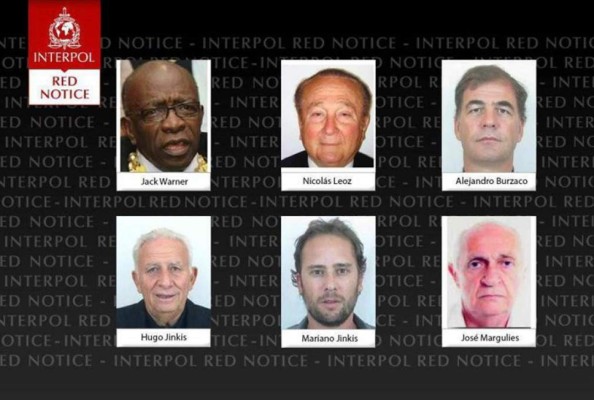 Estas alertas son avisos de búsqueda internacionales o peticiones de extradición contra el trinitense Jack Warner, exvicepresidente de la Fifa, y el paraguayo Nicolás Leoz, antiguo miembro del comité ejecutivo de la organización, así como contra cuatro dirigentes empresariales, tres argentinos y un brasileño.