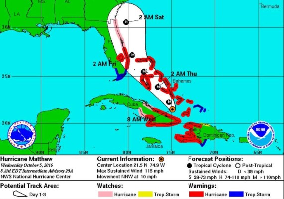 'Matthew se moverá a través de las Bahamas esta noche y mañana (jueves), y se espera que esté muy cerca de la costa este de Florida mañana en la noche', informó el Centro Nacional de Huracanes (NHC) de Estados Unidos, con sede en Miami, en su boletín de las 21h00 GMT.