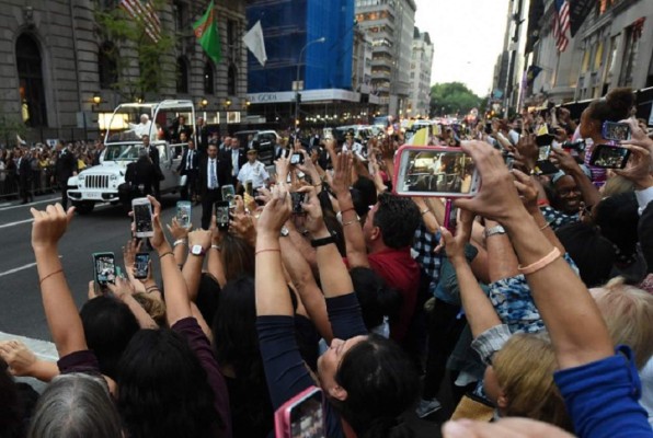 Como ha ocurrido desde su llegada a Estados Unidos el miércoles, miles de personas aguardaban para saludar a Francisco en su papamóvil en la Quinta Avenida, vallada y bajo un rígido dispositivo de seguridad de la policía.