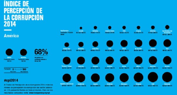 Más de dos tercios de los 175 países incluidos en el índice de Percepción de la Corrupción 2014 obtuvieron una puntuación inferior a 50, en una escala de 0 (percepción de altos niveles de corrupción) a 100 (percepción de bajos niveles de corrupción). Dinamarca se sitúa en la primera posición de 2014, con una puntuación de 92, mientras que Corea del Norte y Somalia comparten el último lugar, con apenas 8 puntos.