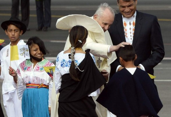 El papa Francisco instó al presidente Rafael Correa a fomentar 'el diálogo y la participación sin exclusiones' a su llegada este domingo a Ecuador, país sacudido desde hace un mes por manifestaciones a favor y en contra del gobierno izquierdista.