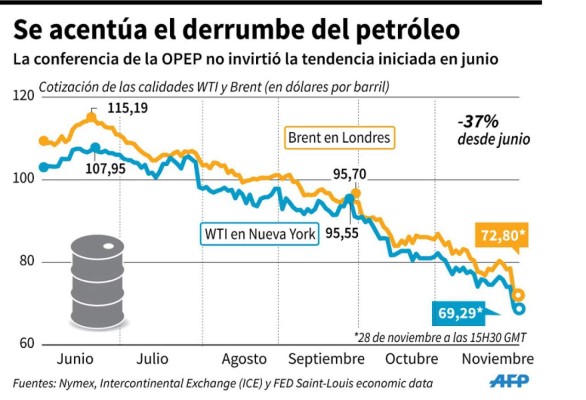 Ante ese derrumbe de las cotizaciones, que han caído un 35% desde junio, algunos países del cartel, entre ellos Venezuela, pidieron en vano una reducción de la producción para volver a hacer subir los precios.