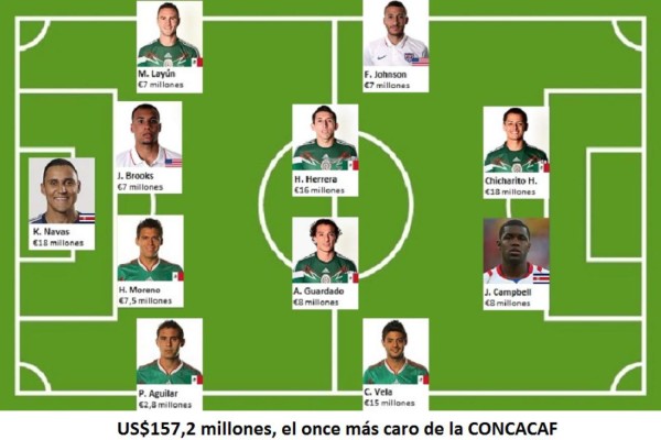 Estrategia & Negocios ha analizado cuál sería el once más caro de la CONCACAF, que a día de hoy daría un valor de US$157,2 millones (114,3 millones de euros), más otros US$45,6 millones (41 millones de euros) de los siete jugadores sentados en el banco. Eso daría un total de US$202,4 millones.