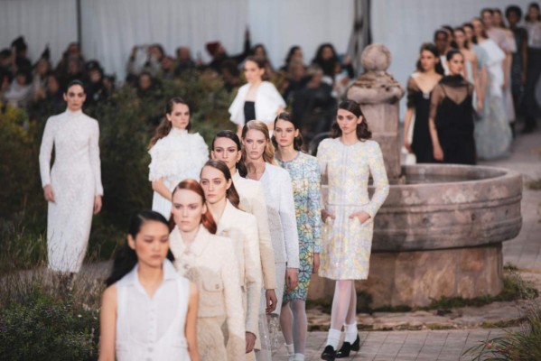 Para el espectáculo de CHANEL Primavera-Verano 2020 Alta Costura, Virginie Viard invita a una decoración inspirada en el jardín del claustro de la Abadía de Aubazine. Un lugar, donde Gabrielle Chanel pasó una parte de su infancia, que nutrió al estilismo de la marca: el piso pavimentado con diferentes motivos como estrellas, vidrieras y sus patrones geométricos entrelazados, el rigor de los hábitos en blanco y negro, los cuellos y las batas de las pupilas de embarque.