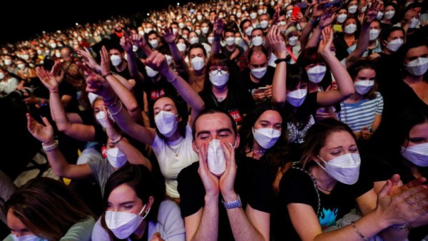 El público, el personal y la banda - Love of Lesbian - son parte de un experimento masivo que, según los organizadores, es el concierto más grande sin distanciamiento social en la era del COVID-19. El evento de este sábado en Barcelona ofrece un vistazo de cómo pueden ser los conciertos masivas durante mucho tiempo después de que la pandemia disminuya.