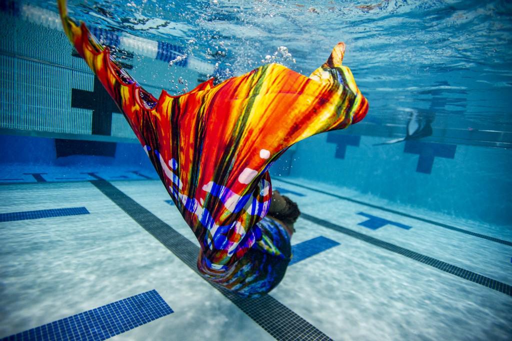 Simples amateurs o “sirenas profesionales” que despliegan su talento en el mundo del espectáculo o para eventos privados, compiten en las piscinas del centro acuático con sus disfraces.