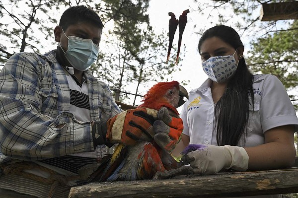 'Estas crías se van a liberar el 28 de junio', cuenta la ingeniera agrónoma Karina Escalante, del estatal Instituto de Conservación Forestal (ICF), mientras marca las dos aves con un tinte morado dentro de una jaula.