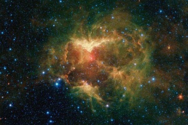 Invisible para el ojo humano, tres longitudes de onda de luz infrarroja componen la imagen multicolor de la nebulosa que se ve aquí. El verde y el rojo representan la luz emitida principalmente por el polvo que irradia a diferentes temperaturas, aunque algunas estrellas también irradian de manera prominente en estas longitudes de onda. La combinación de verde y rojo en la imagen crea tonos amarillos. El azul representa una longitud de onda emitida principalmente, en esta imagen, por las estrellas y algunas regiones muy calientes de la nebulosa, mientras que las regiones blancas indican dónde los objetos son brillantes en los tres colores. La estrella tipo O aparece como una mancha blanca en el centro de una concha de polvo roja cerca del centro de la región excavada.