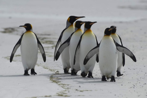 Caminando por la playa en fila india, con la cabeza en alto como en actitud altiva, los pingüinos rey son uno de los principales atractivos de la industria del turismo de las islas Malvinas.