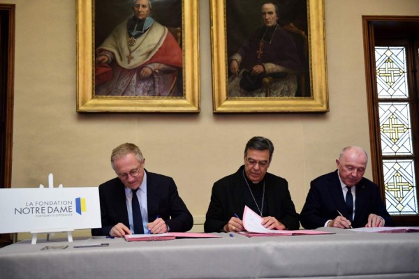 'Lo siento, monseñor, me olvidé el talonario de cheques', bromeó Pinault antes de firmar el convenio con el arzobispo de París, Michel Aupetit. A la firma también acudió su hijo François-Henri, presidente de Kering.