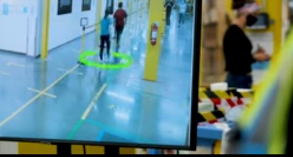 El sistema de realidad aumentada funciona con la ayuda de cámaras y una pantalla grande que dibuja círculos virtuales alrededor de los empleados para alentarlos a mantener una distancia de aproximadamente dos metros entre ellos.