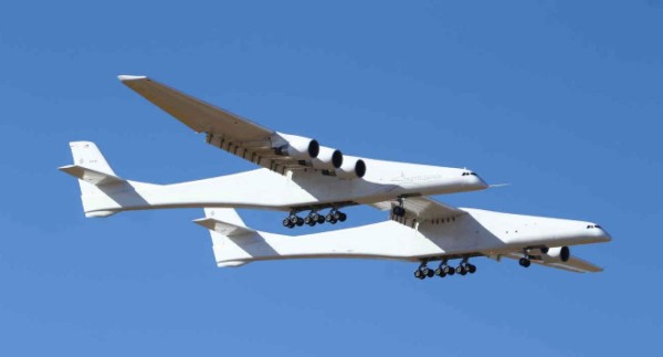 La aeronave, con dos fuselajes y seis motores Boeing 747, sobrevoló en su viaje inaugural el desierto Mojave.