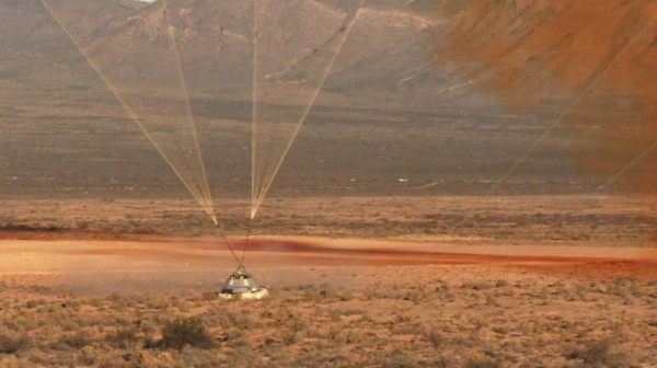 Imágenes transmitidas por la Nasa mostraron el regreso a la Tierra de la cápsula, durante la noche, tras un descenso desacelerado por tres enormes paracaídas.