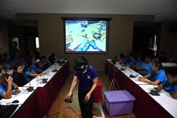 'Hay que juntar las pruebas de identidad', comenta la policía Chanika Sookreang con su cascos de realidad virtual en una comisaría de Chonburi, entre Bangkok y Pattaya. Visualiza una escena de horror que podría haber sido ocasionada por la explosión de una bomba o por un tsunami.