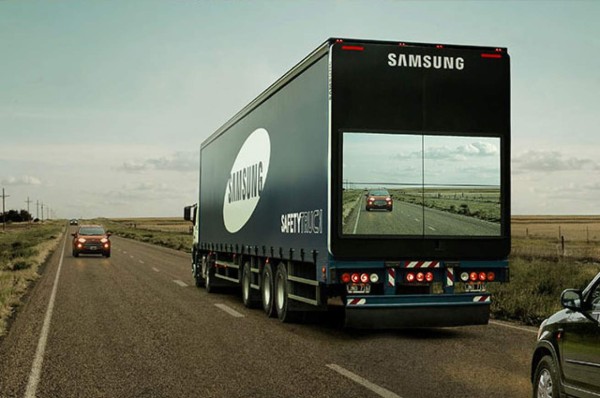 El concepto que desarrolla Samsung consiste en incorporar en un camión una cámara inalámbrica en la parte delantera y cuatro pantallas gigantes en la parte posterior. Eso hace posible que los conductores ubicados detrás puedan observar cómo fluye el tráfico por delante y aminorar los riesgos que puede involucrar el adelantamiento.
