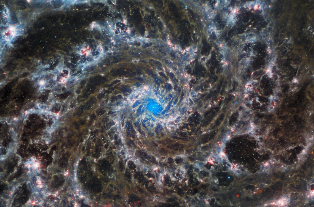 La imagen del telescopio Webb muestra los brillantes apéndices blancos, rojos, rosas y azul claro de la galaxia que se arremolinan alrededor de un centro azul brillante con el oscuro espacio profundo como telón de fondo.